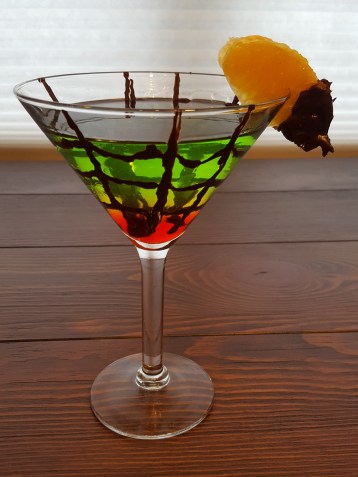 - For a blood effect, drizzle grenadine down the side of the glass.Garnish with a chocolate-dipped orange slice.